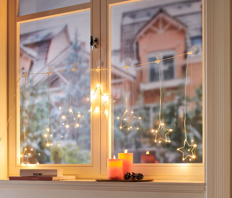 - Küçük yıldızlar için her biri 5 mikro LED'li ve büyük yıldızlar için her biri 8 mikro LED'li metal telden yıldızlar, ışık rengi sıcak beyaz