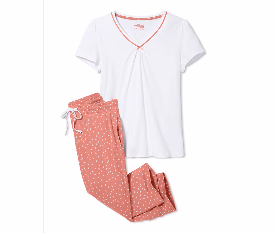Pijamanın üst kısmı hafif kabarık kollara sahiptir, V yakalıdır ve modaya uygun büzgülerle süslenmiştir. Komple puantiye baskısı düz kesimli ve kısa paçalı alt kısmına zamansız görünümünü kazandırır. Bağcıklı elastik bel bandı sayesinde pijama altı rahat şekilde oturur. Yan kısımlarında cepler bulunur.