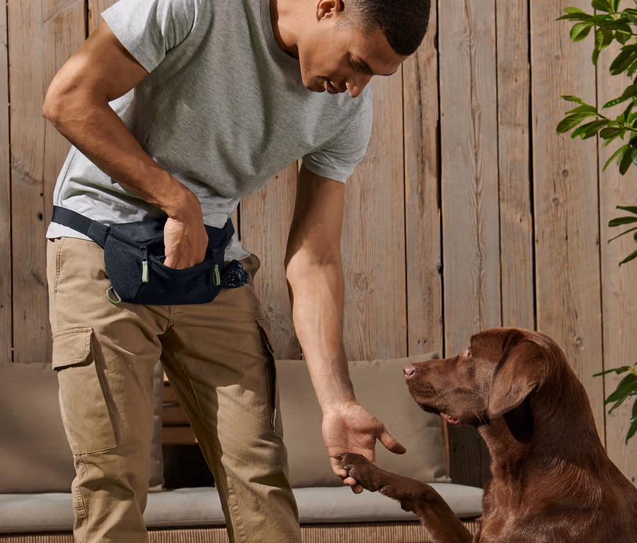 - Ödül maması, küçük oyuncaklar veya tasma vb. için entegre file bölmeli fermuarlı ön cep