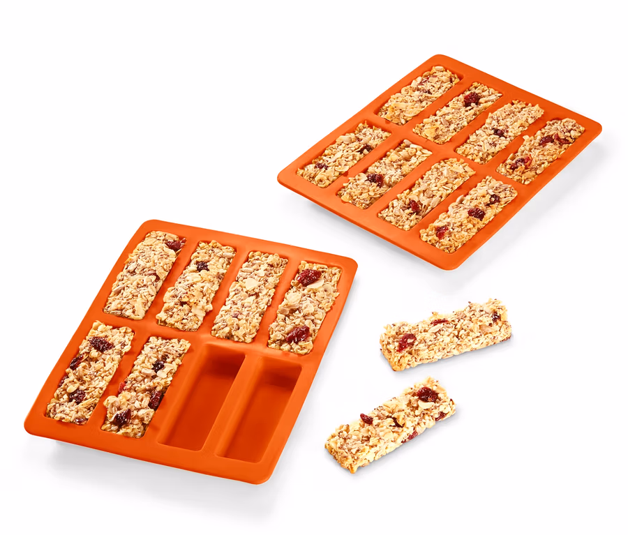 Lezzetli, tek tek ve kendiniz yapın! Bu turuncu silikon kalıplarla çok kolay biçimde 16 adete kadar müsli bar yapabilirsiniz! Kulağa lezzetli mi geliyor? Zaten öyle! Çünkü müsli bar hazırlamak tek başına yepyeni bir iş olsa da, endişe etmeyin çünkü harika tarifler de kutuyla beraber geliyor. Ve pişirme bittikten sonra da zevk devam ediyor: Zira barlarınız kolayca kalıptan çıkacaktır.