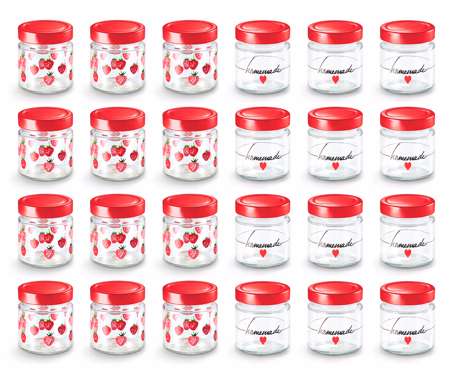 - Kavanozlar kırmızı-pembe çilek baskılı veya kırmızı kalpli siyah yazılı şeffaf