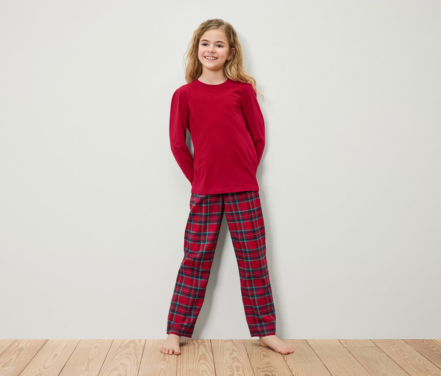 Pijama üstü kırmızı. Pijama altı kırmızı üzeri çok renkli kareli desenli