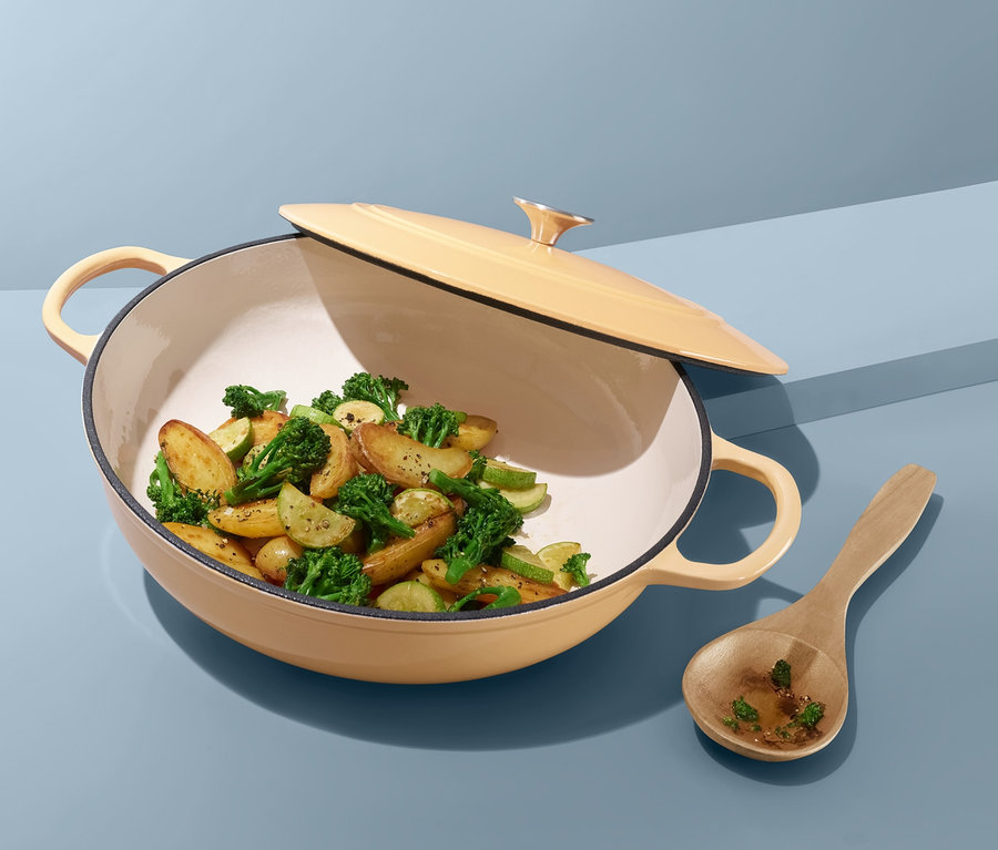 Emaye dökme demirden kızartma tavası bir köy evi mutfağı klasiğidir. Geleneksel bozulmayan malzeme kombinasyonu kızartma tavasını son derece dayanıklı ve uzun ömürlü hale getirir. Bu nedenle fırın ve endüksiyon dahil tüm ocak tipleri için uygundur. Hazırlama özellikleri de ikna edicidir: Kızartma tavası kenarlarına kadar eşit bir ısı dağılımı ve uzun süren bir ısı koruması sunar. Kaliteli paslanmaz çelik kapak tutacağı zevkli ve değerli tasarımını mükemmel şekilde tamamlar – ve plastik tutacağın aksine fırın için yüksek sıcaklıklarda kullanmak için de uygundur. Ağızda dağılan tüm etki tencere yemekleri için mükemmeldir.