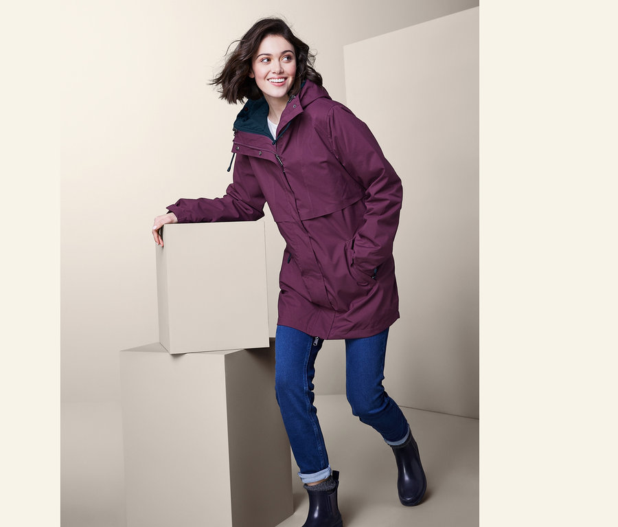 Fonksiyonel mont birçok harika özelliğe sahiptir: Tafta astarı dengeli bir vücut iklimini destekler, çift yönlü fermuarlı dış mont ideal hareket özgürlüğü sunar, iki adet fermuarlı yan cep örneğin akıllı telefon ve anahtarlar için alan sağlar. Arka kısmı trendy ters pliseli yuvarlak etek ucu, gizli fermuarı ve çene koruması kadın mantosunun tek kelimeyle iyi görünmesini sağlar. Yağmur mantosunun kol ağızlarının genişliği çıt çıt düğmeler ile ayarlanabilir, bu da konforu tamamlar.