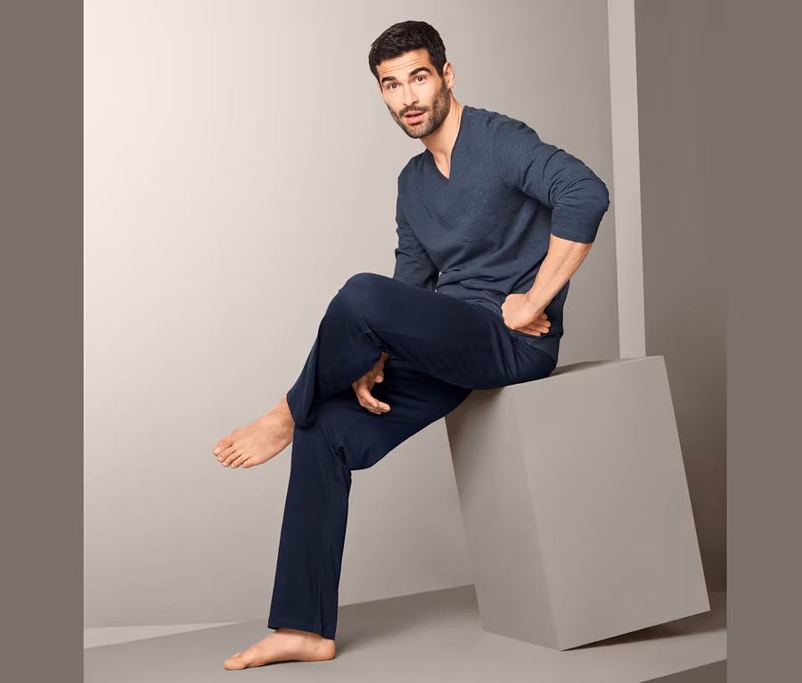 Bu pijama takımı ile gerçekten de "iyi geceler" diyeceksiniz! Saf pamuktan Single-Jersey kumaşı olağanüstü yumuşaktır ve sizi sarmak için davet eder. Alt kısmı da elastik bel bandı ile son derece rahattır ve ayrıca bağcığa ve iki adet yan cebe sahiptir. Bir göğüs cebine sahip olan üst kısmı V yaka kesimlidir. En iyisi de: Erkek pijama takımı organik pamuktandır.