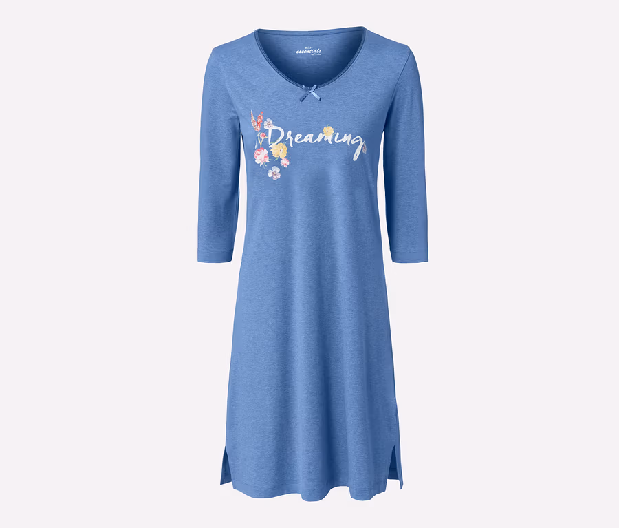 Bu kadın geceliği ile tatlı rüyalara – taze mavi rengi, çiçek motifleri, »Dreaming« yazılı baskısı ve kenarlarındaki şeritleri ile gecelik romantik bir dokunuşa sahiptir. Yırtmaçları bacaklarınıza hareket özgürlüğü ve yüksek bir taşıma konforu sunar.