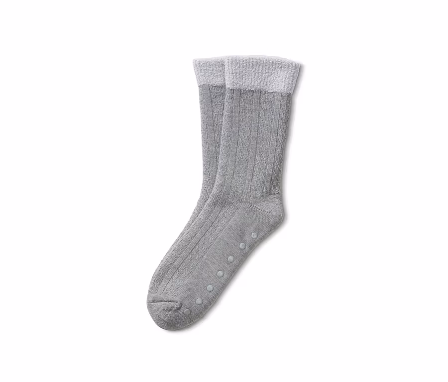 Terlik mi, çorap mı? Cevap ev çorabı! Bu yumuşacık çok yönlü çorap, kabarık pelüş astarıyla ayaklarınızı içeriden ısıtmakla kalmaz, aynı zamanda dekoratif şerit örgü deseniyle göze hitap eder. Yumuşak pelüş bant ile çoraplar ayağınızı sıkmaz ve formunu koruyan elastan içeriği yüksek düzeyde konfor ve mükemmel oturuş sağlar. Kaymaz noktacıklar ile güçlendirilmiş burun ve topuk kısımları, ev çorabının gerekli tutuşa sahip olmasını sağlar.