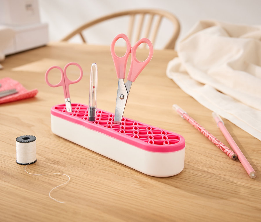 - Makas, dikiş sökücü, kalemler, veya cetveller gibi malzemeleri dik konumda saklamak için ideal
