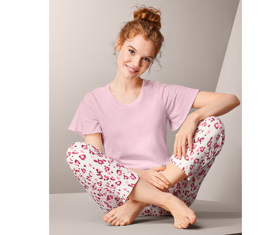Kadın pijama takımı tişört stilinde yuvarlak yakalı ve yarasa kollu bir üst kısmın yanı sıra, rahat, elastik bel bantlı ve kısa paçalı bir alt kısma sahiptir. İyi bir gece, dinlendirici bir uyku için ideal koşullar – ve yeni güne süper bir başlangıç için.