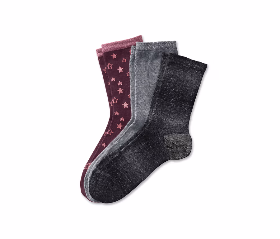 Biraz göz kamaştırıcılık her zaman iyi olduğu için, bu üçlü set halindeki çoraplar gümüş rengi iplik ile işlenmiştir. İster küçük yıldızlı kırmızı, ister açık ya da koyu gri, parıldayan detayları ile kibar, kutlama uygun.