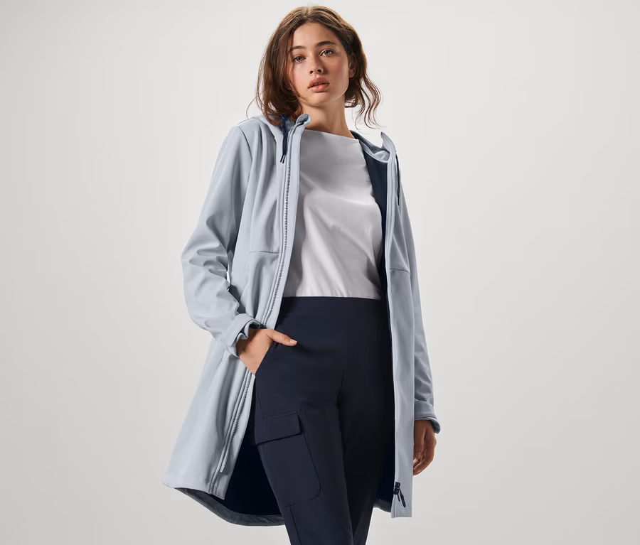 - Yüksek kapamalı, ayarlanabilir kordonlu kapüşon