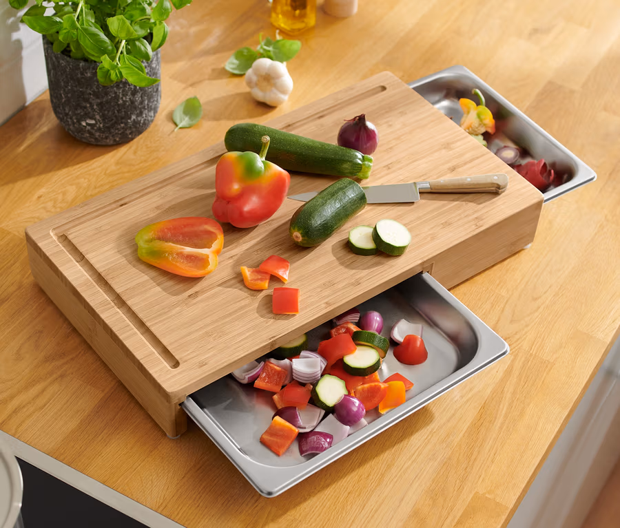 - Kolay temizlenir – kesme tahtası elle silinebilir, tepsiler bulaşık makinesinde yıkanabilir