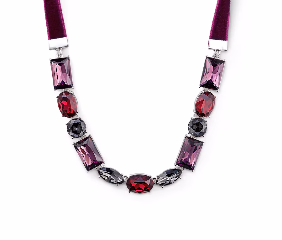 Bu kolye bir moda ifadesidir; çünkü kadife bantlı bağlantısı ve yontulmuş cam taşları sayesinde her kıyafeta özel bir dokunuş kazandıran, heyecan verici bir görünüm oluşturur. Uzunluğu 43 ile 48 cm arasında ayarlanabilen kadın kolyesi, hem uzun hem de kısa şekilde takılabilir.