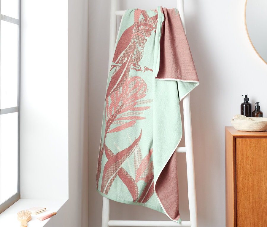 Tropikal tasarımlı kadife banyo havlusu, turkuaz