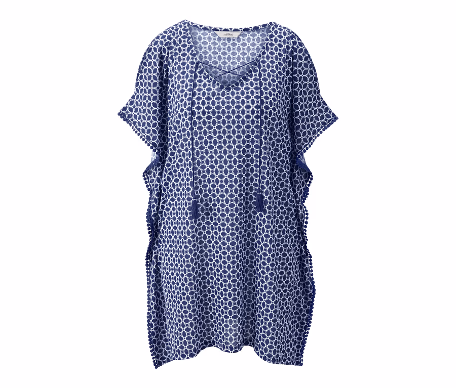 Rahat şekilde yumuşak, hafif Single-Jersey kumaştan üretilen plaj tuniği havadar olmasıyla giyim konforu sunar ve modaya uygun yazlık bir parçadır. Yüksek oranda organik pamuktan üretilmiştir ve tamamen yazlık baskılar ile tasarlanmıştır. Kordonlu ve püsküllü V yaka kesimi, yan dikişlerindeki dekoratif bordür ve modaya uygun delikli, düşük kesim omuzları panço kesimine nitelik kazandırır.