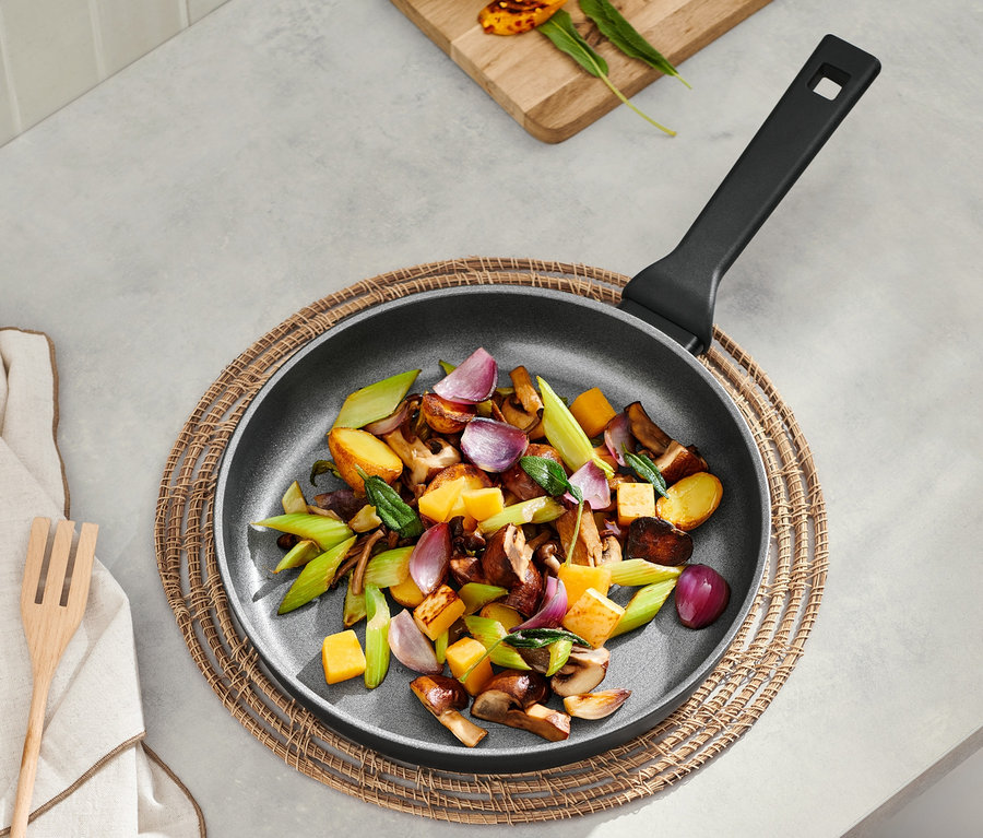 - PFAS içermeyen yapıştırmaz kaplamalı – yağsız pişirme için idealdir, yanmayı ve yapışmayı en aza indirir, çizilmeye karşı korur, temizlemesi kolaydır