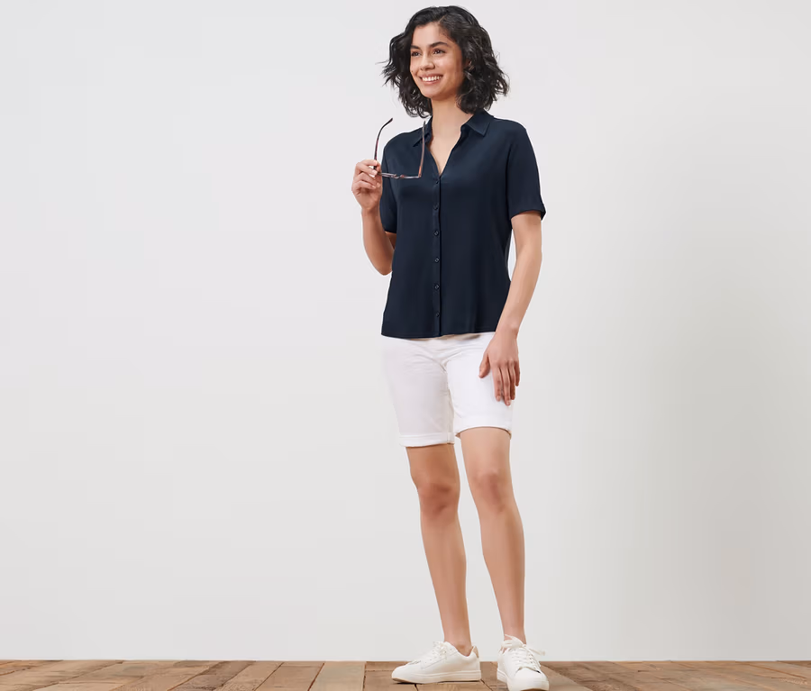 - Kol ağızları sabit katlanmış, hafif dökümlü kısa kollu