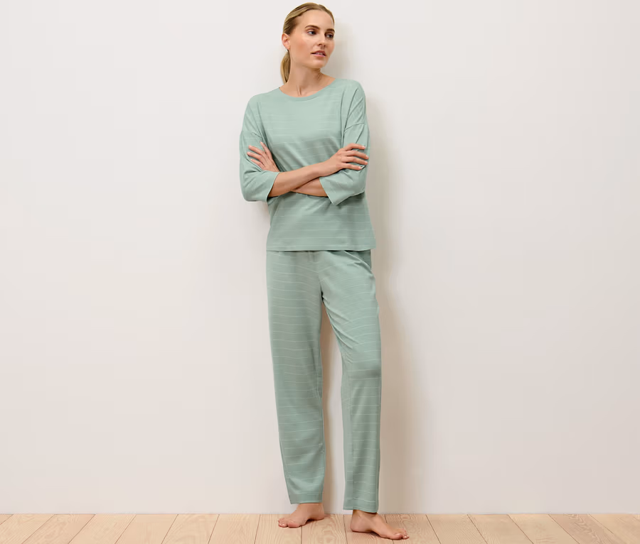 - Pijama üstü ve pijama altı açık yeşil-krem rengi halka desenli