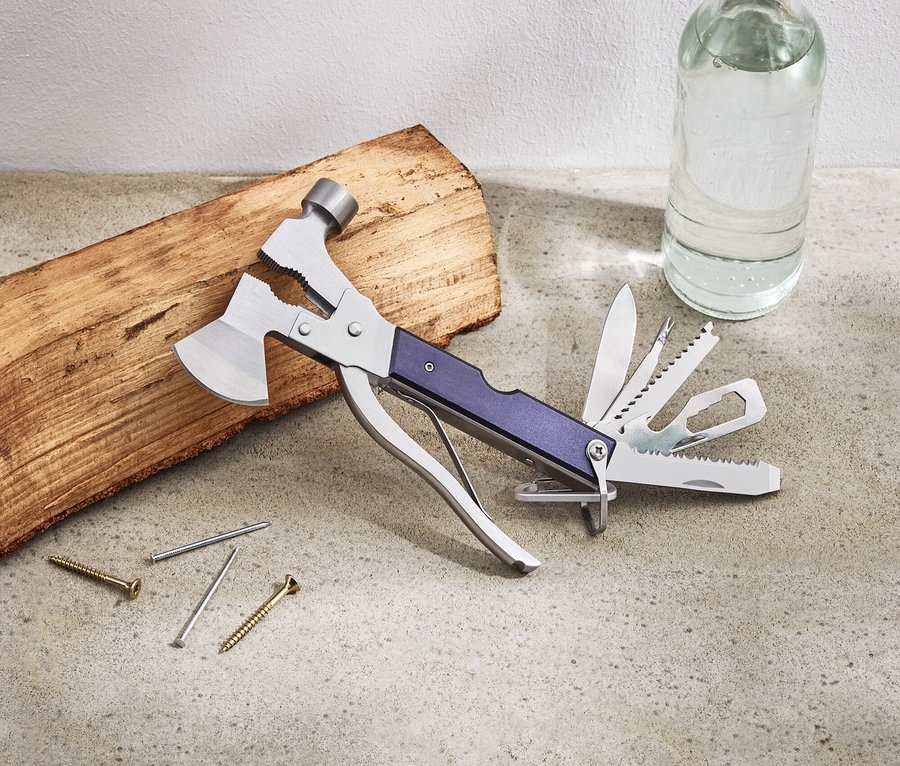 - 11 fonksiyon: balta, çekiç, düz kenarlı bıçak, pense, eğe, ağaç testeresi, testere, yıldız tornavida, düz tornavida, anahtar (6, 7, 8, 10 mm) ve şişe açacağı