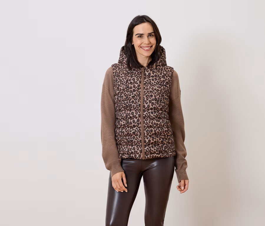 Kapüşonlu Kapitone Yelek, Tamamı Kahverengi Siyah Leopar Baskılı Bej