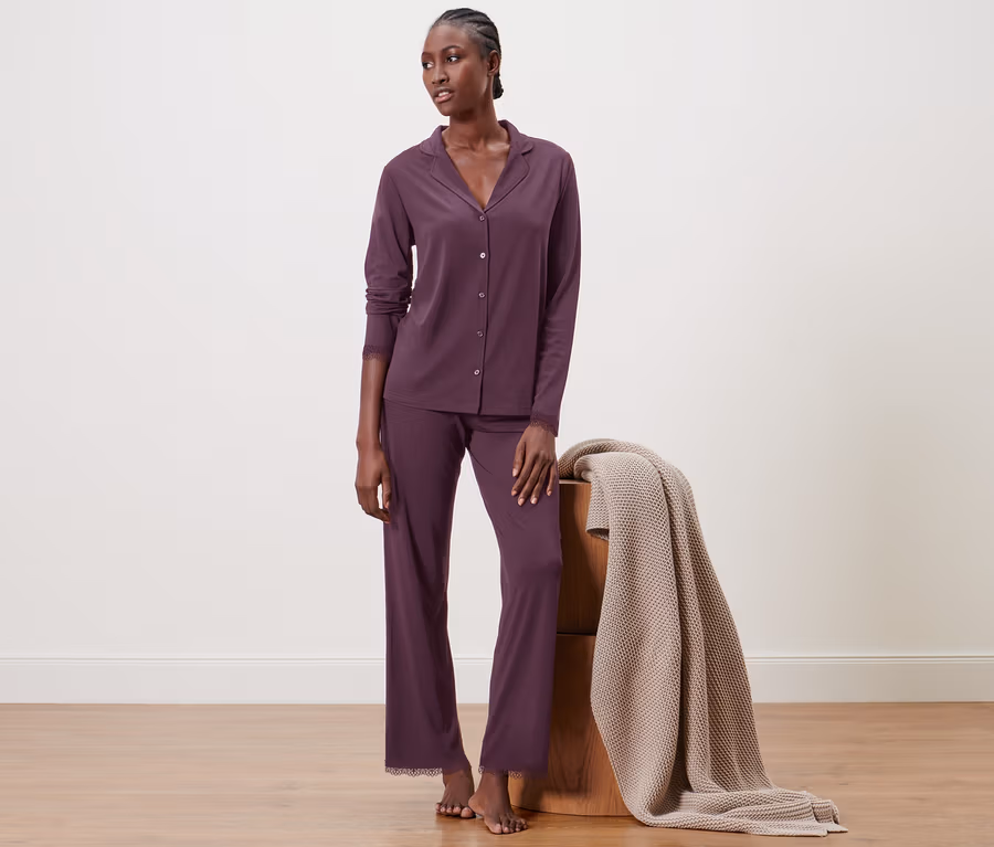 - Yakalı, boydan boya düğmeli ve uzun kollu pijama üstü