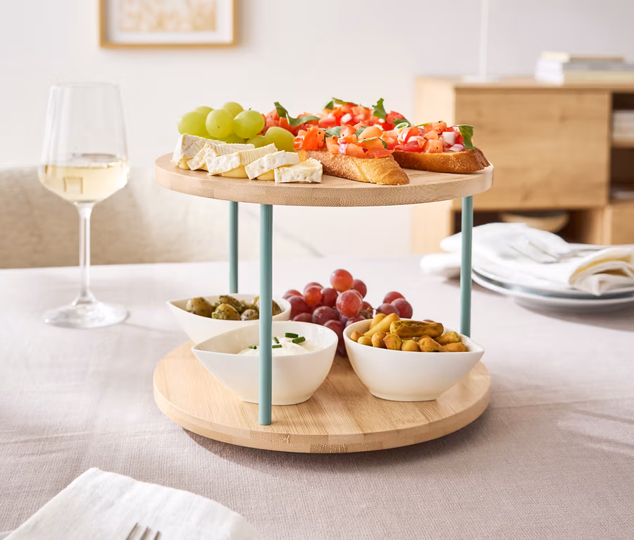 - Kurabiye veya atıştırmalıklar gibi kuru yiyecekler için yeterli yer sunan 2 katlı etajer
