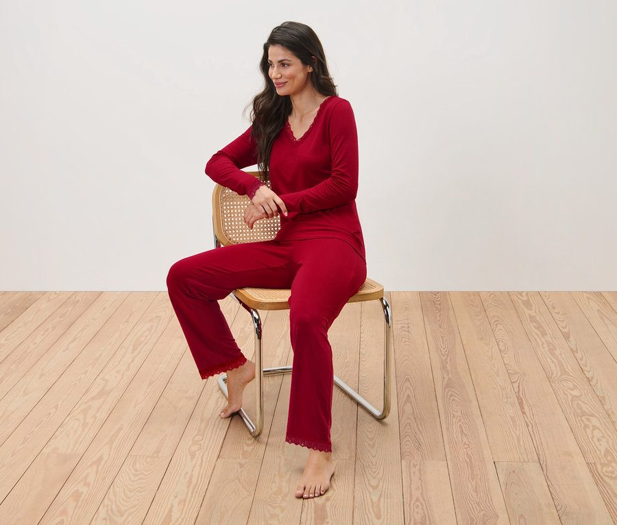 - V yaka, kol ağızları ve paçaları narin dantelli