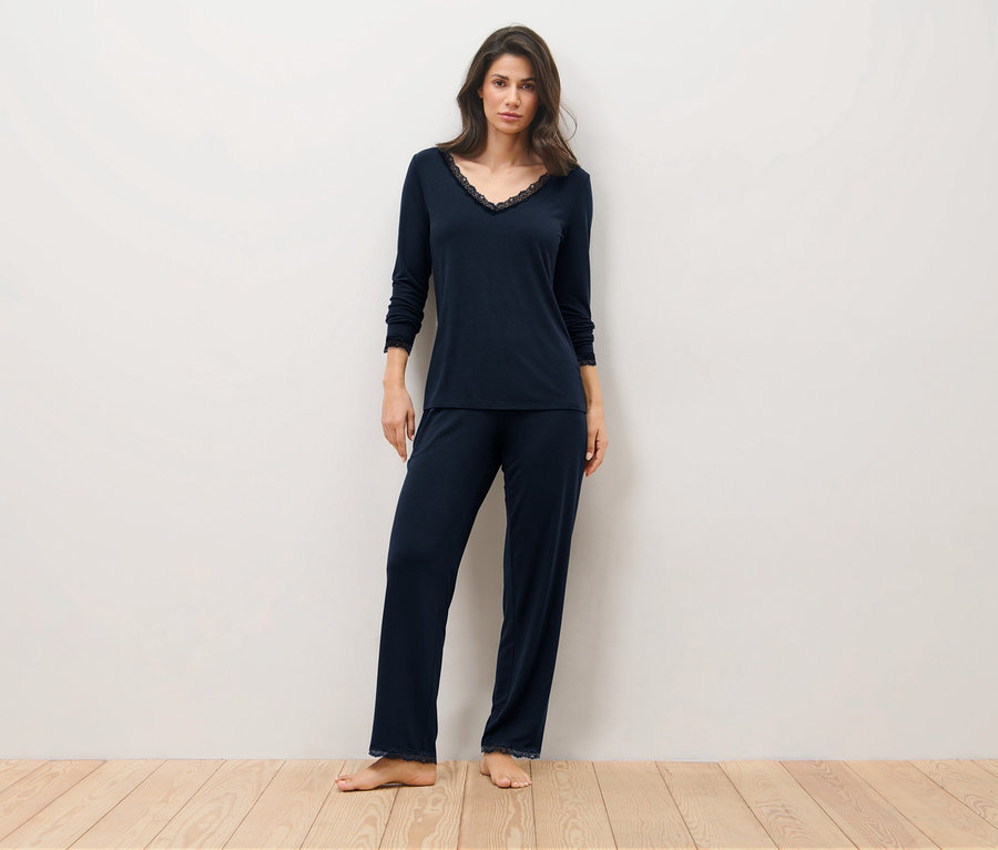 - V yaka, kol ağızları ve paçaları narin dantelli