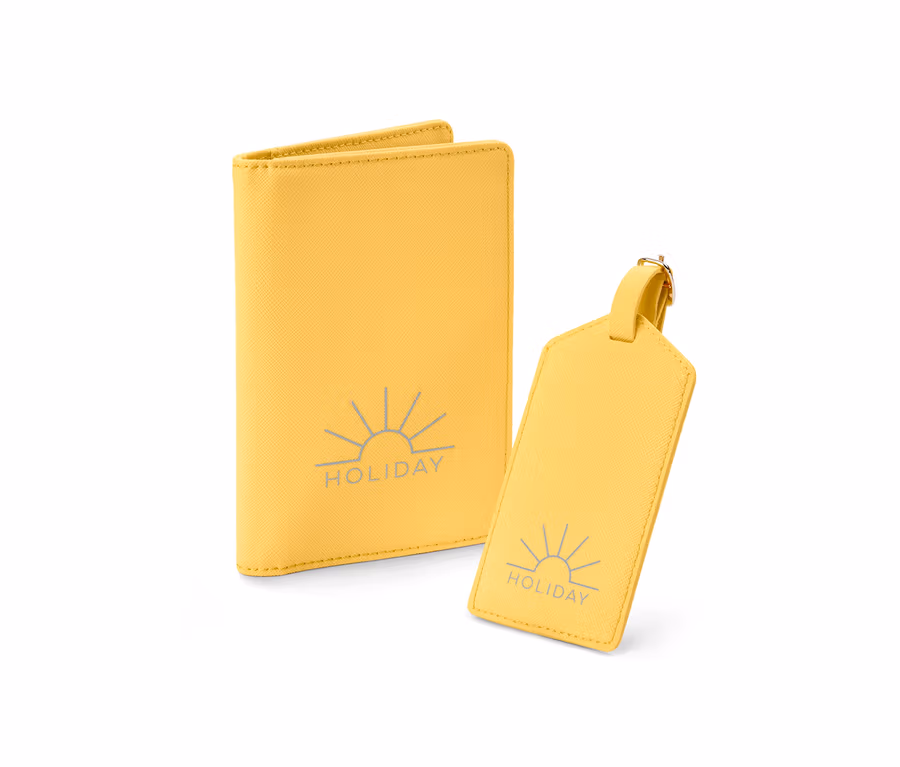 - Bavul etiketi ve pasaport kılıfından oluşan seyahat seti – tatil için ideal