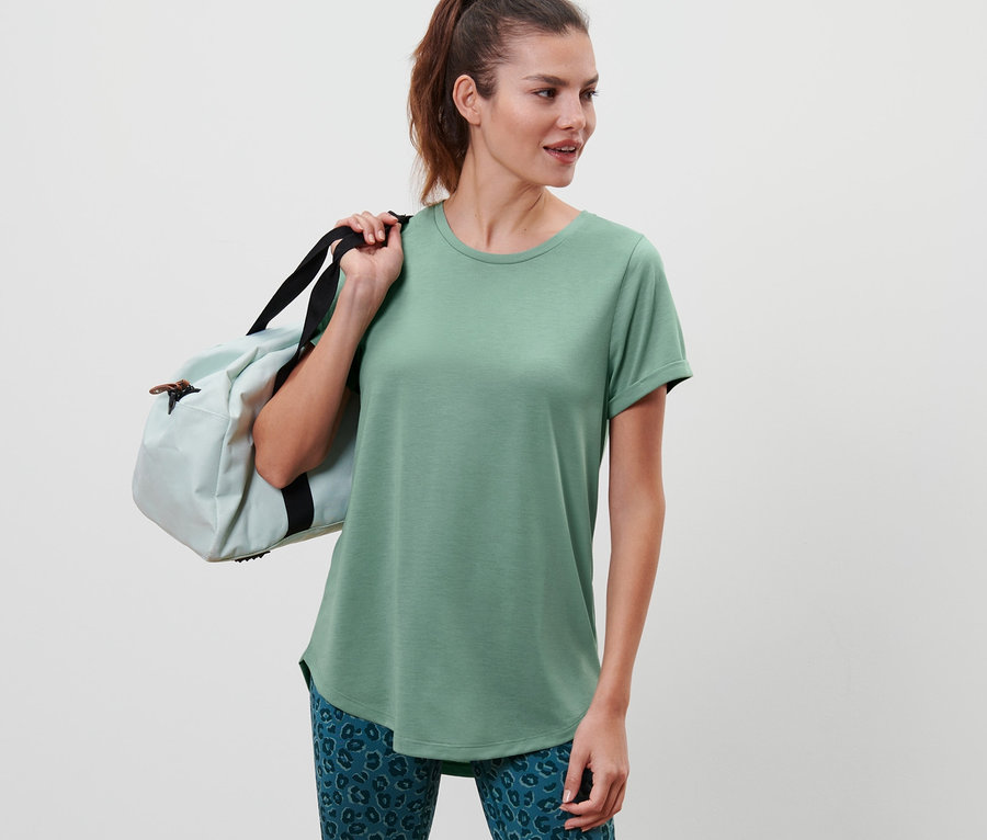 - Viskoz oranlı, son derece yumuşak, dökümlü kumaştan kadın spor tişörtü