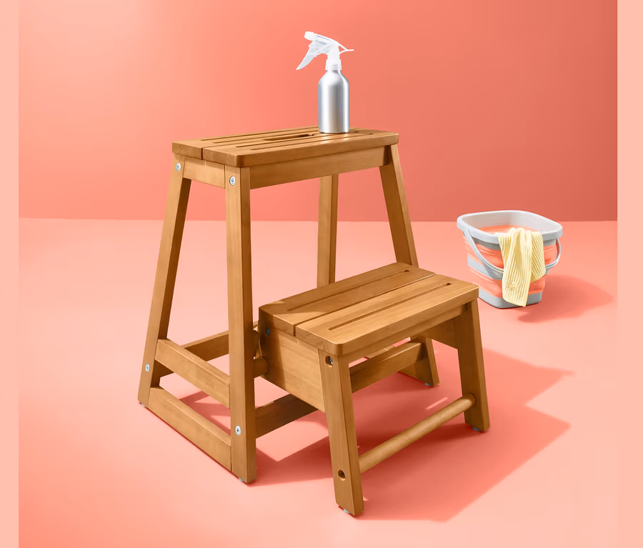 Açık renk cilalı, FSC® sertifikalı okaliptüs ahşabından üretilen basamaklı tabure evde ulaşılması zor yerlere güvenli ve kazasız şekilde uzanmak için son derece faydalıdır – yüksek bir raf, dolabın en üst rafı veya bir ampul fark etmez. Ara basamak ya da raf yüzeyi olarak katlanabilen ayak banklı katlanan merdiven en üst basamağında bir tutma deliğine sahiptir ve bu sayede kolayca kullanılabilir ve taşınabilir. Sağlam, klasik mobilya oturmak için de kullanılabilir.